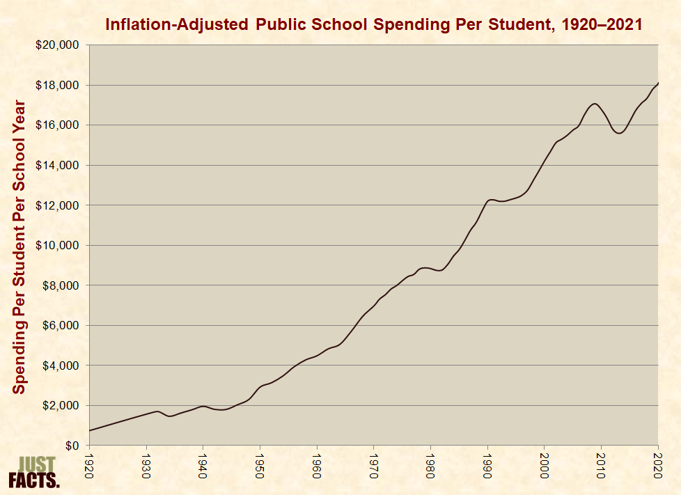 Contrary to a drumbeat of media stories decrying funding cuts to K–12 schools, the national average inflation-adjusted spending per public school student has risen by 25 times since 1920: