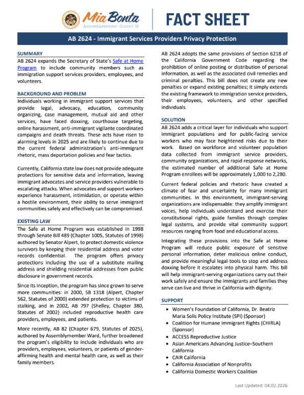 Assemblywoman Mia Bonta’s Assembly Bill 2624 would make it illegal to publicly post, display, disclose, or distribute the personal information or image of any designated immigration support services provider, employee, or volunteer, or other individuals residing at the same home address, with the intent to harass, dox, or threaten them.