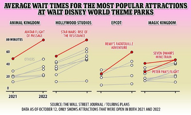Disney has said that over the last ten years, they have invested $31 billion in their parks. Across the Disney parks, average wait times are generally up from 39 minutes to 49 minutes in 2022. See the ride wait times over the years in the chart below.