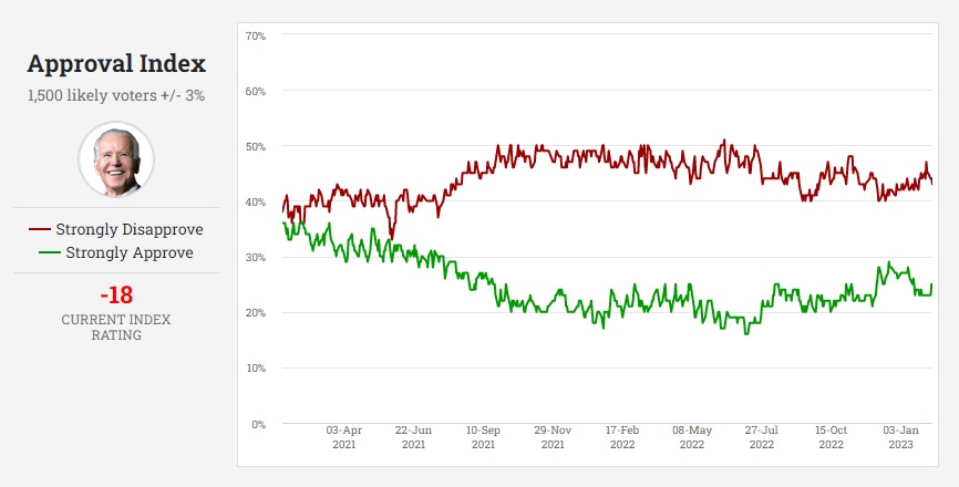 To set the stage for Biden’s SOTU speech, let’s check out the daily presidential tracking poll of Biden. The latest figures include 25% who strongly approve of the job Biden is doing and 43% who strongly disapprove. This gives him a Presidential Approval Index rating of -18. This is currently worse than under the past Trump administration. See this in the chart below and learn more here.