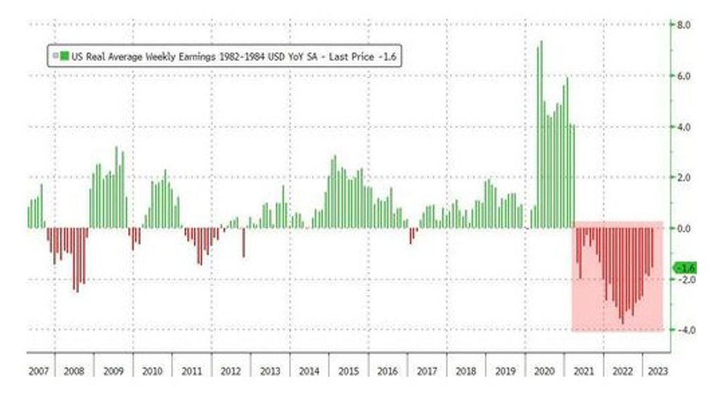 Real wages continue their declining streak – now at 24 months at -1.6%. Hence, on a YoY basis, this means a total of 6.6% decline in real terms for the average American.