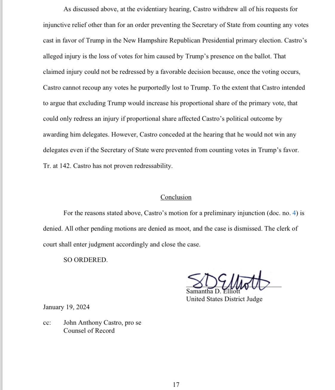 The ruling, posted by Republican lawyer and former California GOP Chairwoman Harmeet Dhillon, was handed down by U.S. District Judge Samantha D. Elliott against long-shot Republican presidential candidate John Anthony Castro, a Texas resident who filed similarly rejected cases in other states.