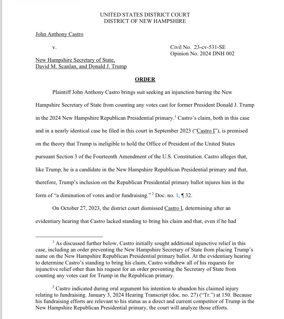 Mr. Castro alleged that because he is a presidential candidate in New Hampshire, President Trump’s inclusion on the ballot injures him in the form of a “diminution of votes and/or fundraising.”