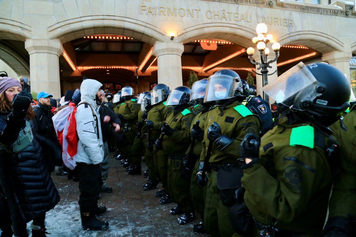 Meanwhile, protesters could be seen making snow barricades on Wellington and Metcalfe streets to slow the police advance toward the core of the protest in front of Parliament Hill.