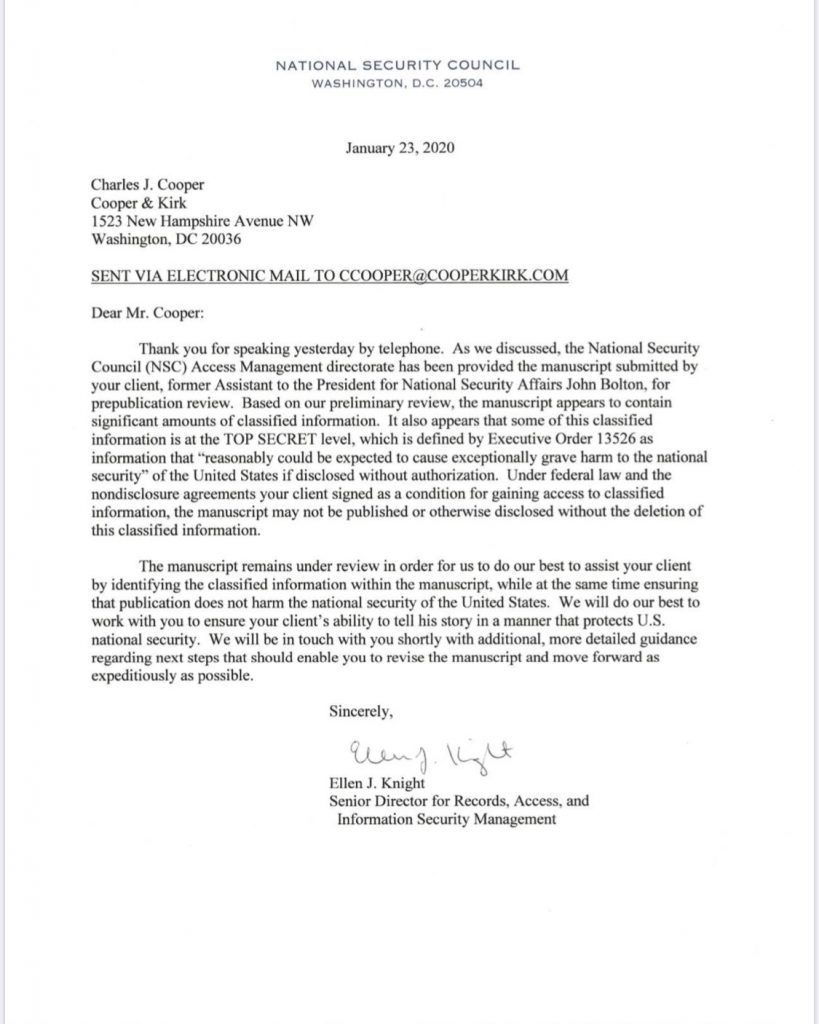 Thank you for speaking yesterday by telephone. As we discussed, the National Security Council (NSC) Access Management directorate has been provided the manuscript submitted by your client, former Assistant to the President for National Security Affairs John Bolton, for prepublication review. Based on our preliminary review, the manuscript appears to contain significant amounts of classified information. It also appears that some of this classified information is at the TOP SECRET level, which is defined by Executive Order 13526 as information that “reasonably could be expected to cause exceptionally grave harm to the national security” of the United States if disclosed without authorization. Under federal law and the nondisclosure agreements your client signed as a condition for gaining access to classified information, the manuscript may not be published or otherwise disclosed without the deletion of this classified information.