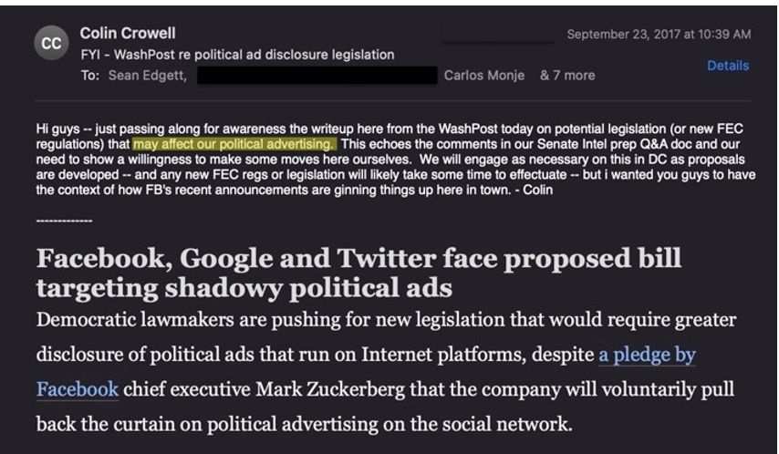 22.“Hi guys.. Just passing along for awareness the writeup here from the WashPost today on potential legislation (or new FEC regulations) that may affect our political advertising,” wrote Crowell. pic.twitter.com/wbHK1s949y