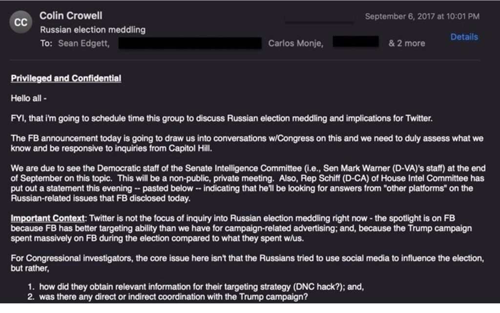 5.“Twitter is not the focus of inquiry into Russian election meddling right now – the spotlight is on FB,” wrote Public Policy VP Colin Crowell: pic.twitter.com/2nzk8pLoCZ