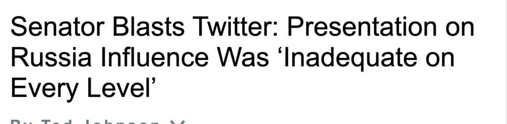 7.Receiving these meager results, a furious Senator Mark Warner of Virginia – ranking Democrat on the Intelligence Committee – held an immediate press conference to denounce Twitter’s report as “frankly inadequate on every level.” pic.twitter.com/DAkX13igEE