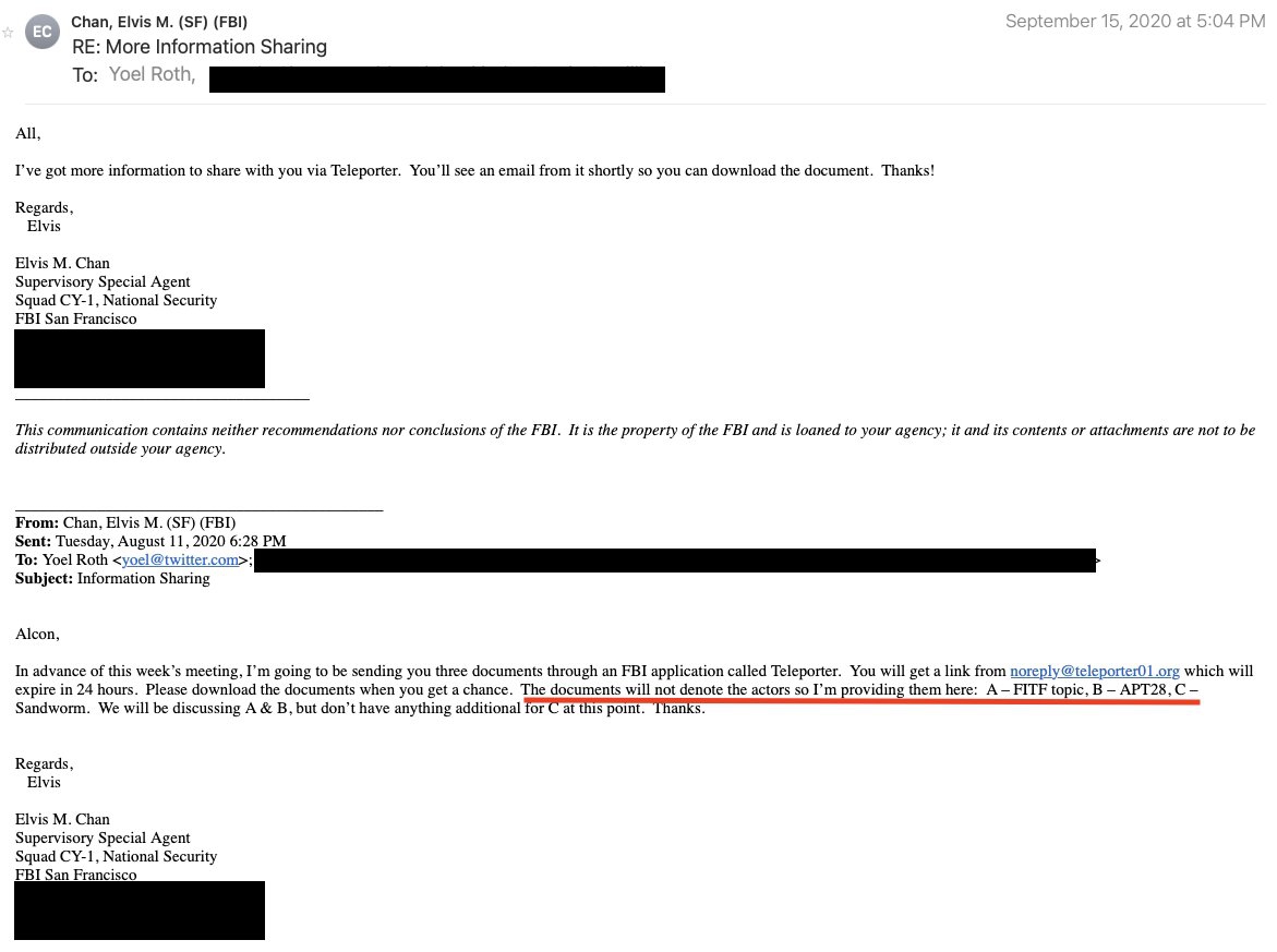 23. On August 11, 2020, the FBI’s Chan shares information with Twitter’s Roth relating to the Russian hacking organization, APT28, through the FBI’s secure, one-way communications channel, Teleporter. pic.twitter.com/HHLpCqcOoy