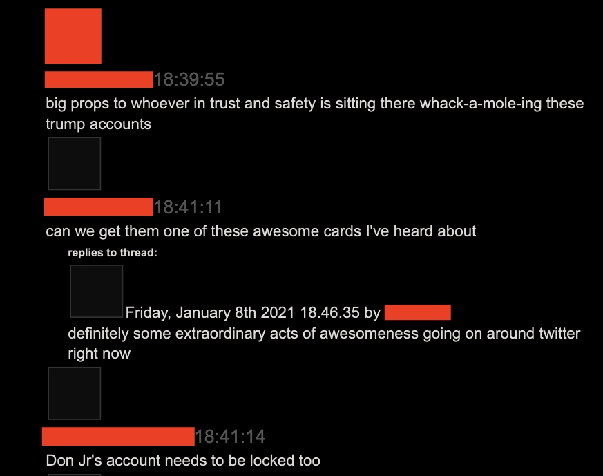 8. But voices like that one appear to have been a distinct minority within the company. Across Slack channels, many Twitter employees were upset that Trump hadnāt been banned earlier.