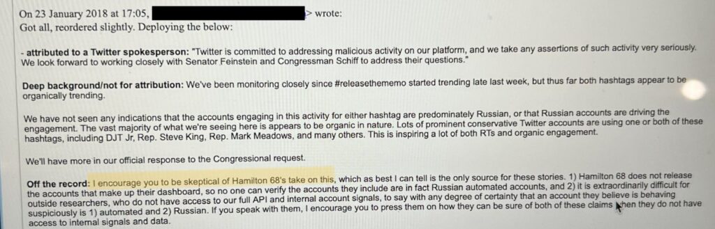 13.Inside Twitter, executives panned Watts, Hamilton 68, and the Alliance for Securing Democracy. Two key complaints: Hamilton 68 seemed to be everyone’s only source, and no one was checking with Twitter.