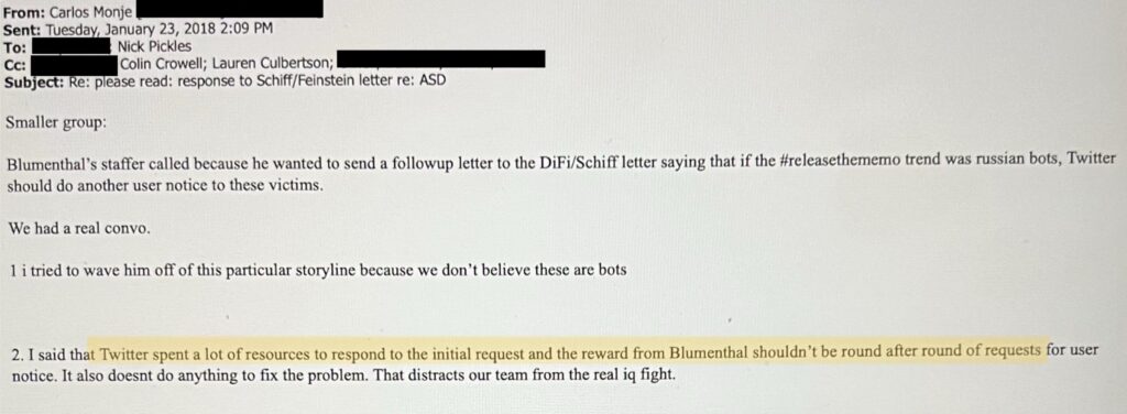 25.They expressed this explicitly to Blumenthal’s camp, saying “Twitter spent a lot of resources” on this request and the reward from Blumenthal shouldn’t be round after round of requests.”