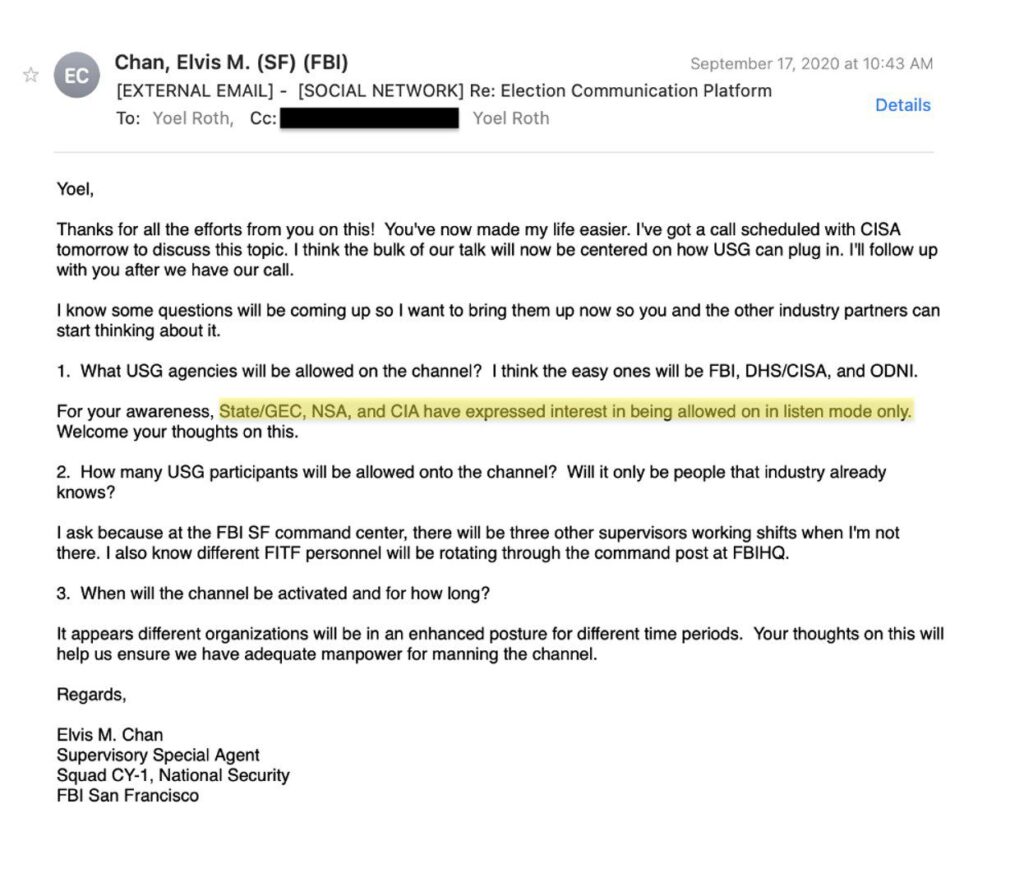 15.“IT MAKES SENSE TO PUSH BACK ON GEC PARTICIPATION IN THIS FORUM” When the FBI informed Twitter the GEC wanted to be included in the regular “industry call” between companies like Twitter and Facebook and the DHS and FBI, Twitter leaders balked at first. pic.twitter.com/S4aUMXW2ed