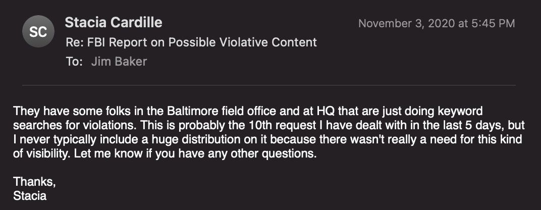 25. The FBI was clearly tailoring searches to Twitter’s policies. FBI complaints were almost always depicted somewhere as a “possible terms of service violation,” even in the subject line: pic.twitter.com/TiwyiZJTNZ