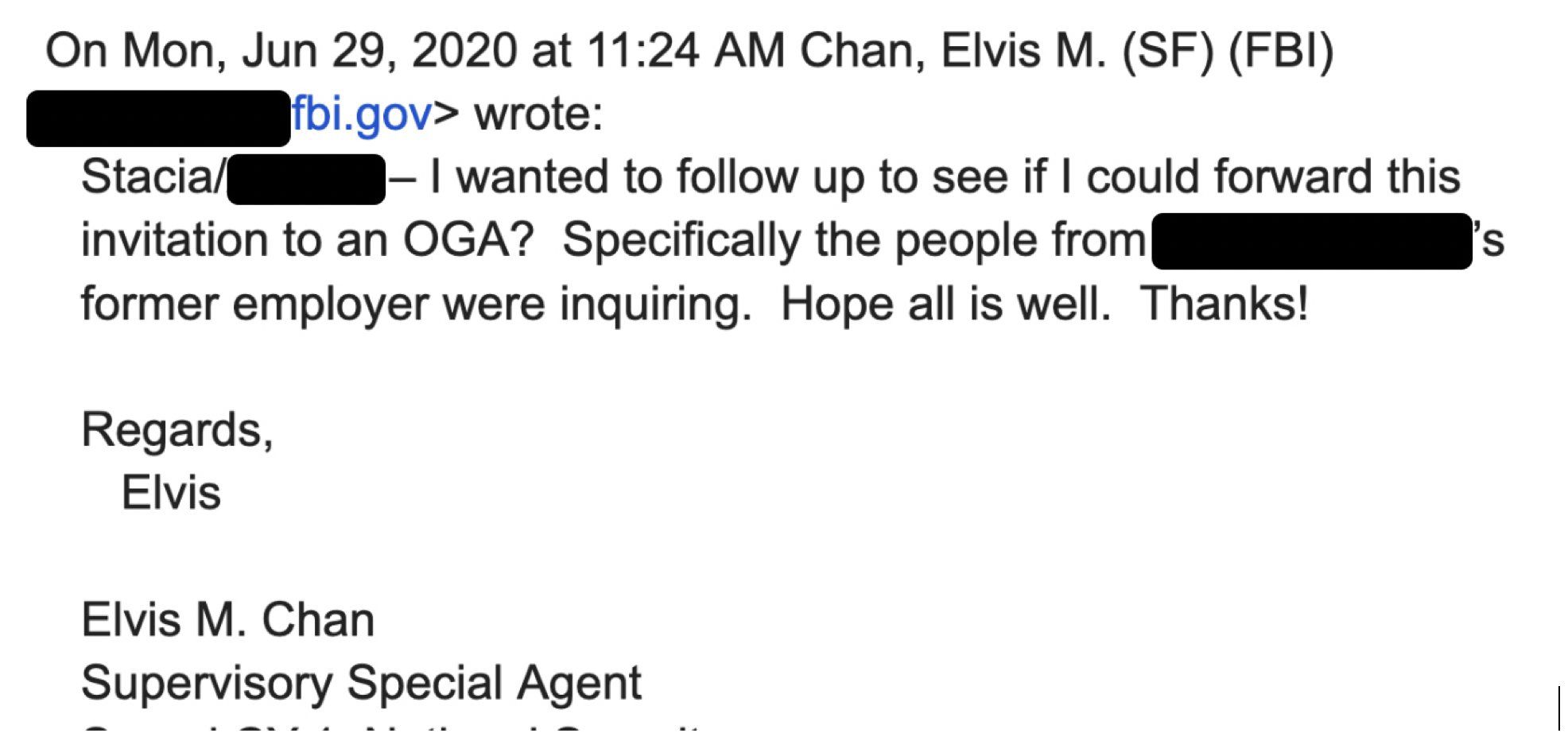 8.On June 29th, 2020, San Francisco FBI agent Elvis Chan wrote to pair of Twitter execs asking if he could invite an “OGA” to an upcoming conference: pic.twitter.com/hj5xZiXvg2